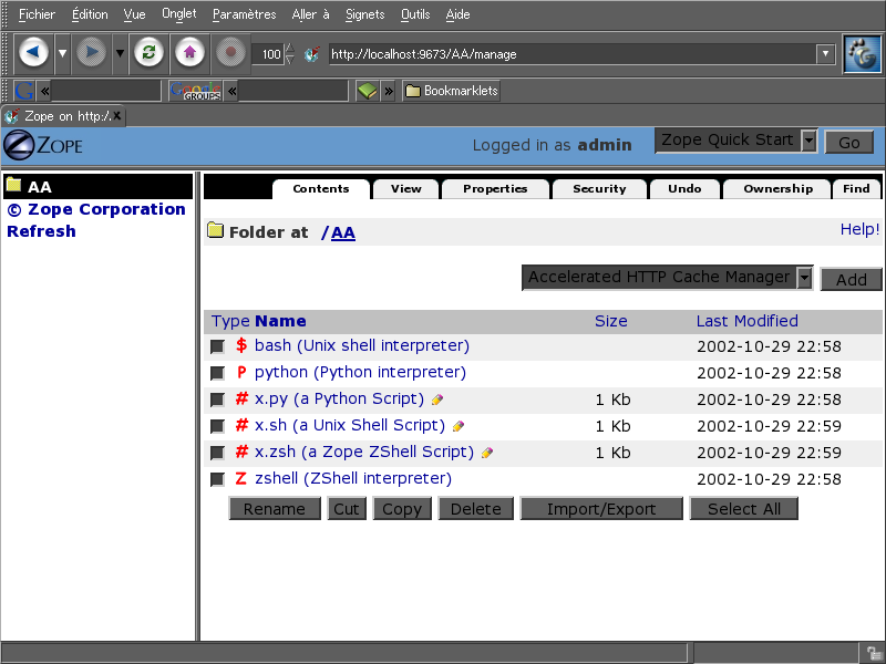 This screenshot of the Zope management interface shows what ZShellScripts can do. There's a Shell (Python) instance, a Shell (Unix) instance, and a Shell (Zope) instance, which are different interpreters for different languages, respectively Python, Unix shell and Zope ZShell. There are three instances of Script (ZShell), which have the very same meta_type, but which contents is completely different one from each other :